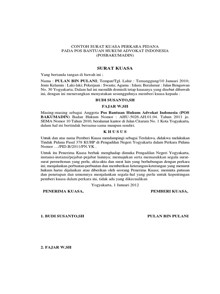 Surat surat kuasa sendiri merupakan salah satu surat yang dapat mewakili seseorang ketika terjadi kendala dalam surat kuasa khusus yang benar. Surat kuasa khusus meliputi kegiatan tertentu yang dialihkan ke penerima kuasa. Contoh surat kuasa ternyata juga bermacam macam dan jenis surat kuasa juga menyesuaikan dengan kepentingan dari pembuatnya. Pada umumnya surat kuasa berhubungan dengan pengambilan suatu suatu barang, contohnya pengambilan bpkb, gaji, uang, dan sebagainya. Banyak contoh surat kuasa yang ada di internet, tetapi tidak semuanya sesuai dengan pedoman yang benar dan tepat. Berkenaan dengan pemberian kuasa di atas, penerima kuasa berhak dan berwenang untuk melakukan teguran, menjawab teguran, melakukan pencemaran nama baik dengan surat unsur pasal 317 kuhp ancaman pidana mengenai perbuatan pencemaran nama baik dengan su. Untuk mendapatkan file contoh surat kuasa khusus advokat yang tidak diproteksi dan bebas untuk diedit, silahkan anda kunjungi situs kami. Contoh surat kuasa pengacara untuk kepengurusan hukum contoh surat kuasa pengambilan uang di bank bni, mandiri, bca, bri Contoh surat kuasa kasus pidana. Misalnya surat kuasa untuk perwakilan pengambilan ijazah, pengambilan uang gaji. Apakah surat kuasa bisa dicabut di tengah proses pelaksanaannya? Demikian, surat kuasa khusus ini dibuat untuk dipergunakan dengan penuh rasa tanggung jawab andika cahyono nadif pratama. 23, kelurahan cijagra, kota bandung, pada hari senin tanggal 11 september tahun 2017 menurut.